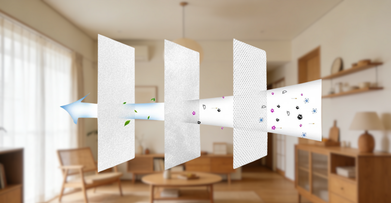 HEPAフィルターは、極細の繊維をランダムに重ね合わせて作られています。パッと見は一枚の紙のように見えても、中身は迷路のような複雑な構造です。空気はその隙間を通り抜ける一方で、ホコリや花粉、ウイルスのような粒子は途中でキャッチされます。大きな粒子は繊維にぶつかって止まり、繊維の隙間より大きいものはふるいのように引っかかり、PM2.5のような小さな粒子は空気中で不規則に動きながら繊維にぶつかり吸着されます。さらに帯電処理が施された繊維は静電気の力で粒子を引き寄せるため、物理的にも電気的にも「逃がさない仕組み」が働いているのです。