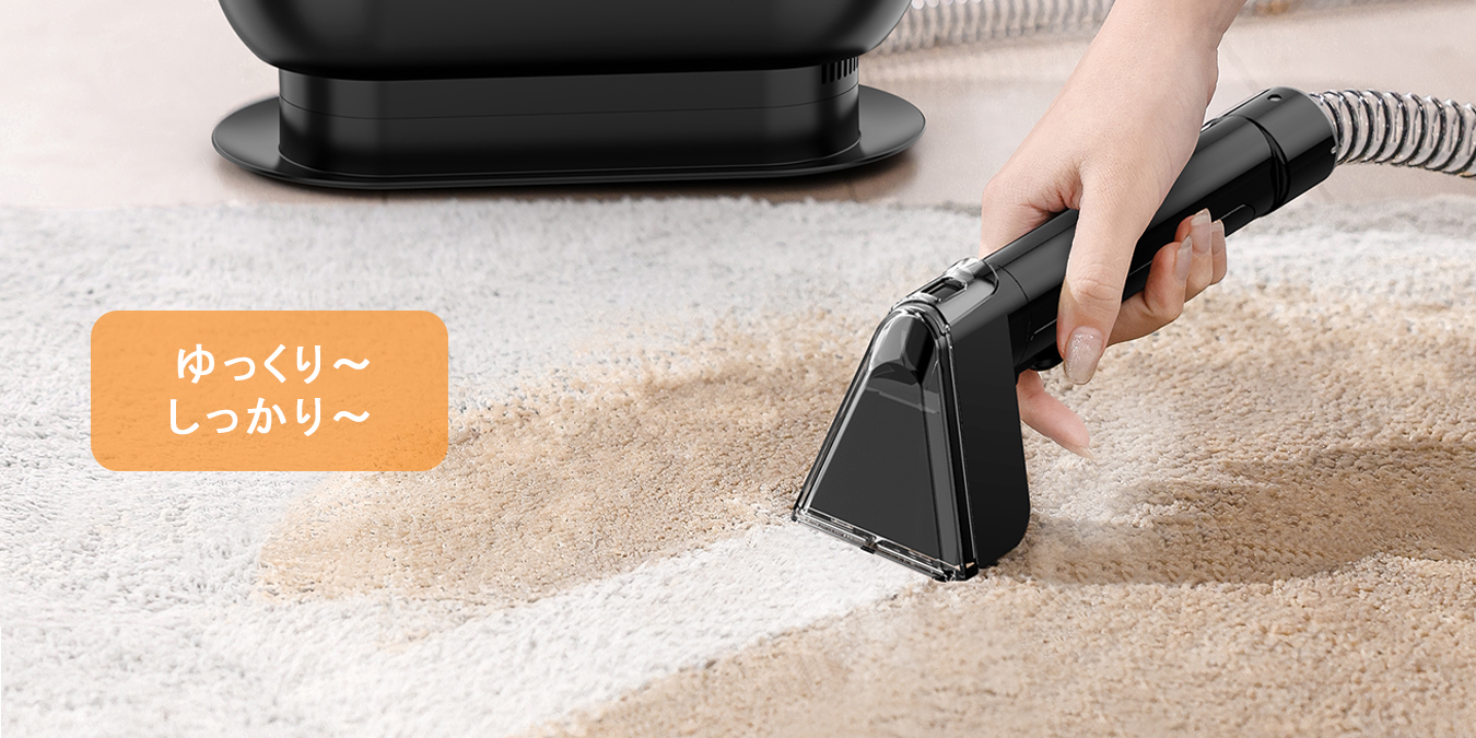 吸引だけ、あるいは出水だけでは汚れは十分に落ちません。そのため、吸引はゆっくりと動かし、布製品にしっかり密着させることが大切です。速く動かすと汚れが吸い取れず、水分だけが残ってしまいます。